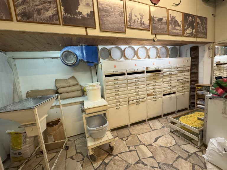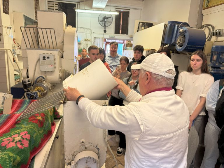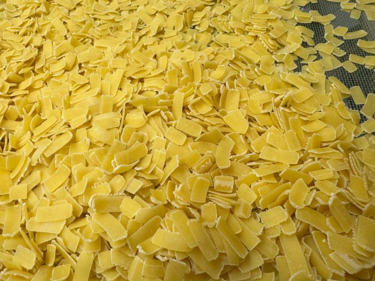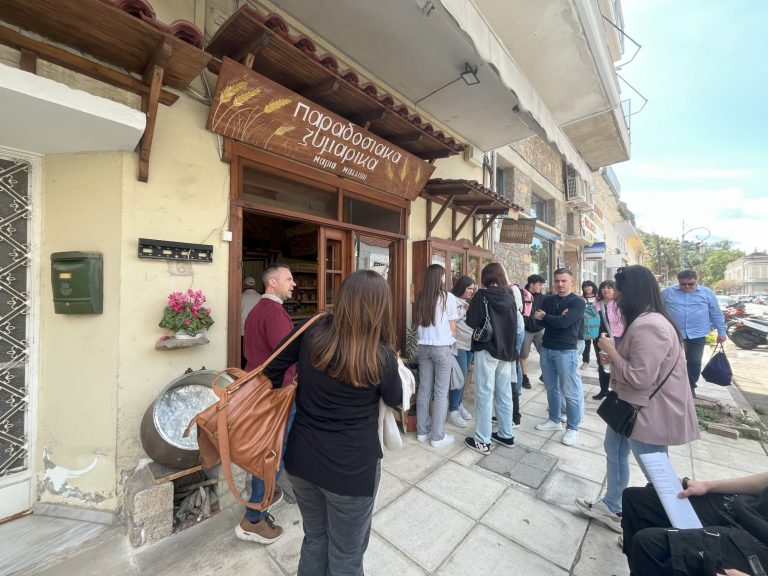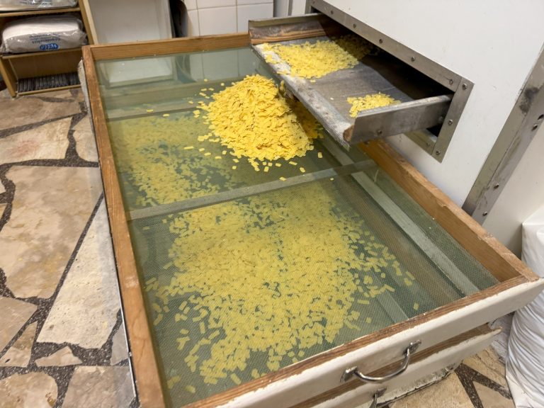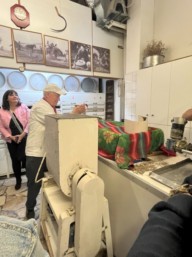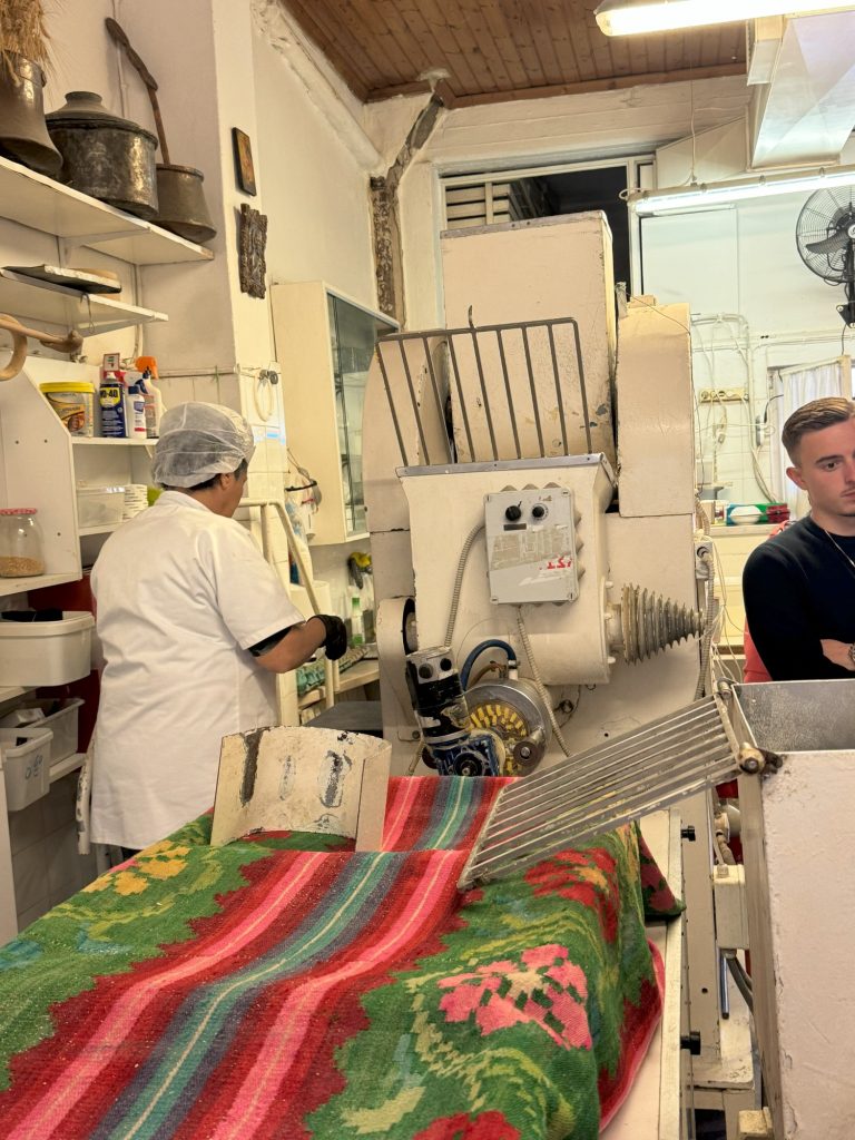 Nach dem Schulbesuch ging es für die gesamte Reisegruppe in eine nahegelegene Nudelmanufaktur. Hier werden noch Nudeln nach alten griechischen Rezepten traditionell in Handarbeit herstellt. In den Teig kommen u. a. frische Eier und Ziegenmilch, die den Nudeln einen einzigartigen Geschmack und Konsistenz geben. Mit Leidenschaft übt der griechische Eigentümer der Manufaktur schon seit über 50 Jahren seinen Beruf aus und ist stolz auf Produktion.