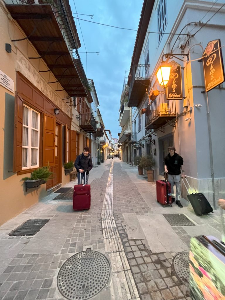 Am Anreisetag trafen sich alle Reiseteilnehmerinnen und -teilnehmer am Flughafen, wo bereits die Vorfreude auf die kommende Woche zu spüren war. Die Aufregung stieg beim Betreten des Flugzeuges, war es doch für einige der erste Flug. Nach einem angenehmen Flug und einer kurzweiligen Busfahrt erreichten alle gut gelaunt ihr Ziel, Nauplia, eine der schönsten Städte der Peleponnes und ehemalige Hauptstadt Griechenlands. Zum gemeinsamen Abendessen ging es in eine griechische Taverne, wo alle herzlich von griechischen Schülerinnen und Schüler, Lehrkräften und Vertretern der Gemeinde begrüßt wurden. Auf das Wiedersehen haben sich insbesondere die Schülerinnen und Schüler gefreut, waren doch die Griechen zwei Wochen zuvor an der CSM und erste Freundschaften wurden geknüpft.