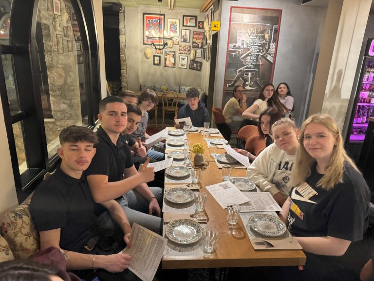 Am Abend stand dann ein besonderes Highlight auf dem Programm, ein griechischer Abend mit Essen und Tanzkurs: Am Restaurant angekommen, wurden wir von Vertretern des griechischen Freundeskreises (um Mitglied zu werden, muss man Deutsch sprechen) sowie von einer griechischen Tanzgruppe herzlich begrüßt. Auch einige griechische Schülerinnen und Schüler, die bereits bei uns in Ottobrunn waren, sind gekommen, um den Abend gemeinsam mit uns zu verbringen. Aus der Speisekarte wurden griechische Spezialitäten bestellt und probiert und so das ein oder andere neue Lieblingsgericht für sich entdeckt. Einfach nur lecker das griechische Essen.