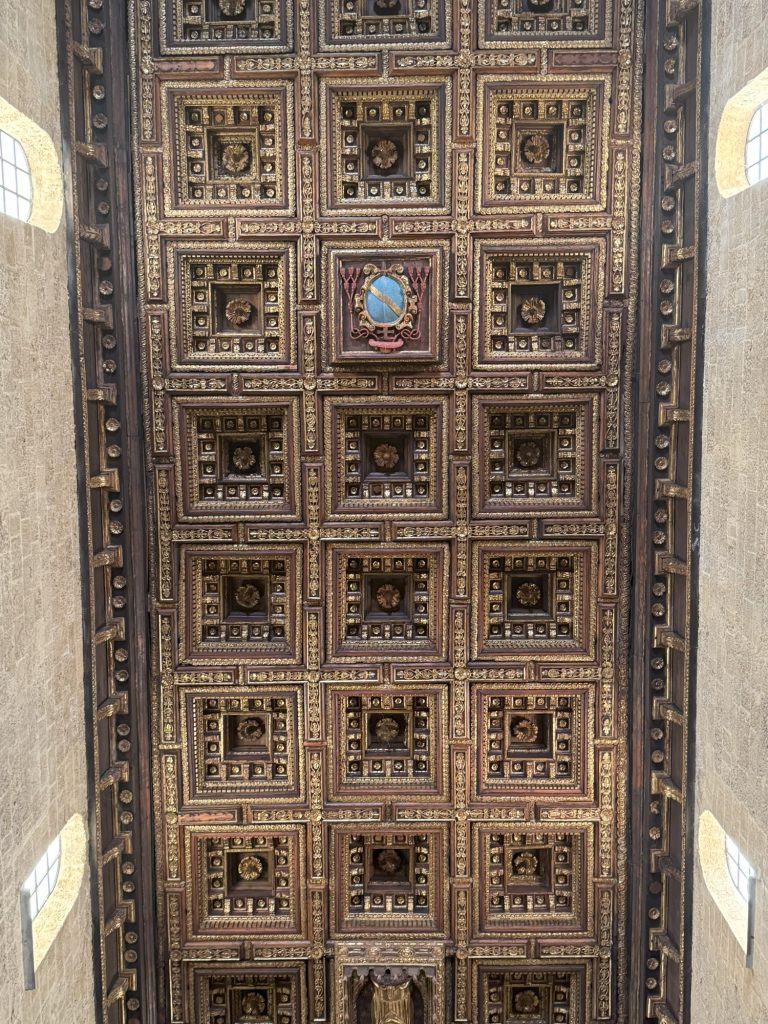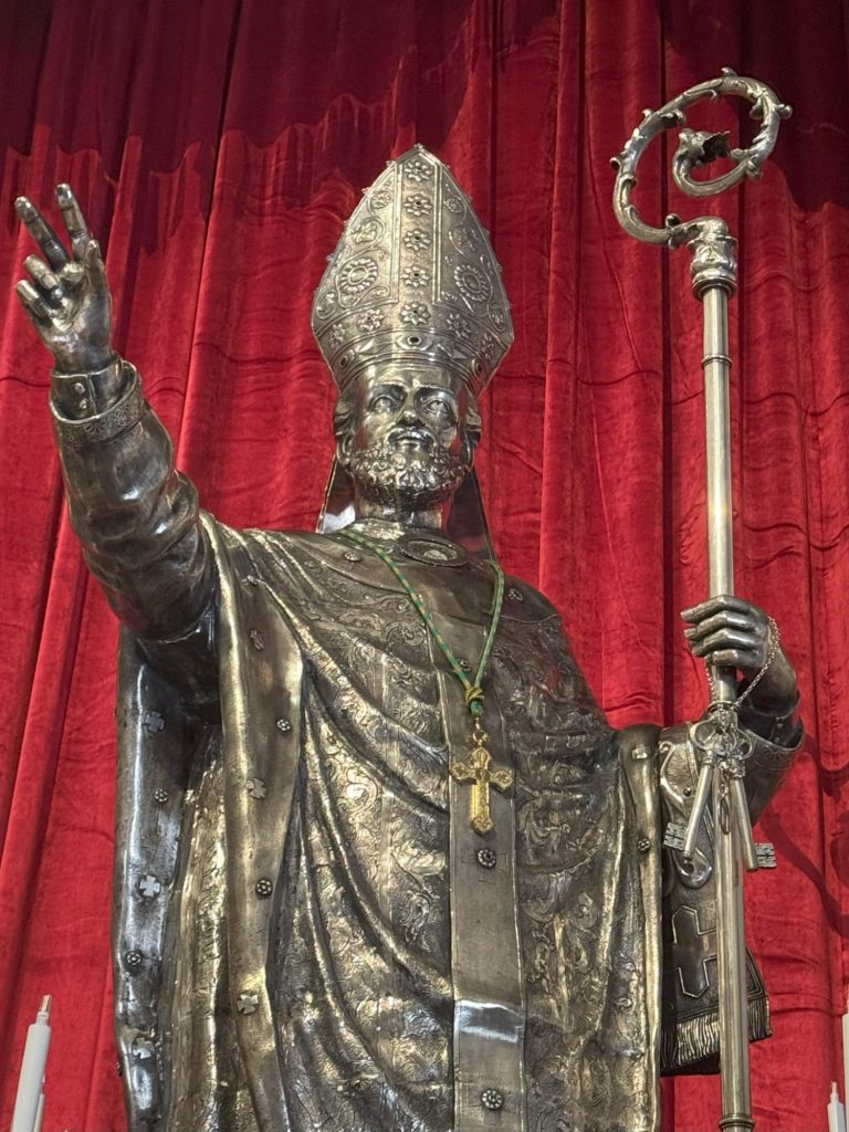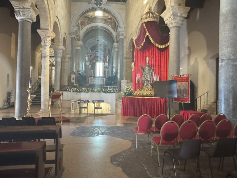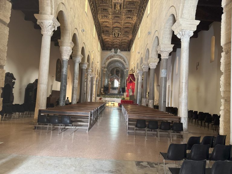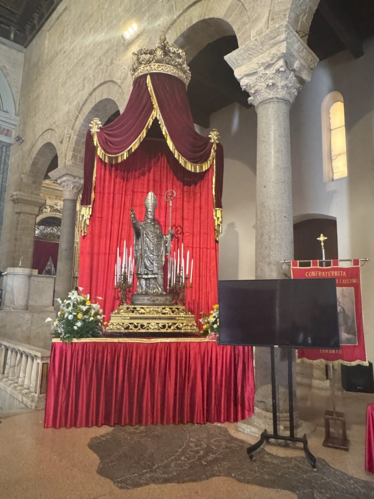 An unserem letzten Tag in Taranto besuchten wir noch einmal die Altstadt mit dem Ziel der Kathedrale von San Cataldo, in welcher die silberne Statue von San Cataldo aufgebahrt ist. Es ist die gleiche Statue, die gestern bei der Prozession durch Taranto gefahren wurde. Von nahem ist sie jedoch weitaus imposanter. Auch der Innenraum der Kirche beeindruckte uns nachhaltig. Die Kathedrale ist die älteste romanische Kathedrale Apuliens und dem Heiligen der Stadt gewidmet.