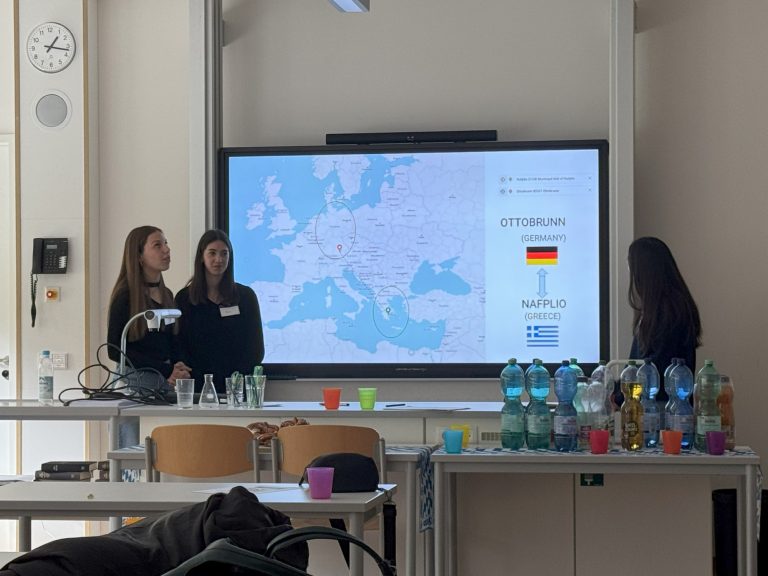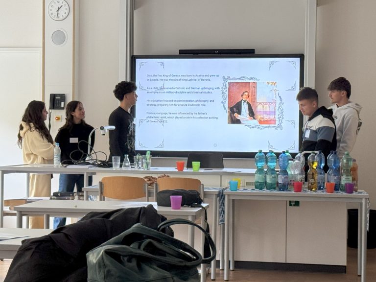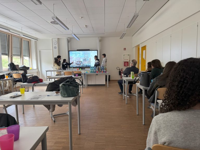Um 13 Uhr fanden dann für interessierte Schülerinnen und Schüler sowie Lehrkräfte der CSM eigens mitgebrachte Vorträge der griechischen Schüler statt. Die Präsentationen beinhalteten zum Einen die bayerisch-griechische Geschichte um König Otto I. von Griechenland und zum Anderen wurde unsere Partnergemeinde Nafplio als auch die Schule (Gel 2) vorgestellt. Um Verständnisschwierigkeiten zu umgehen, wurden diese im perfekten Englisch vorgetragen und man sah, dass sich die Schüler bei der Erstellung der Präsentationen viel Wissen angeeignet hatten.