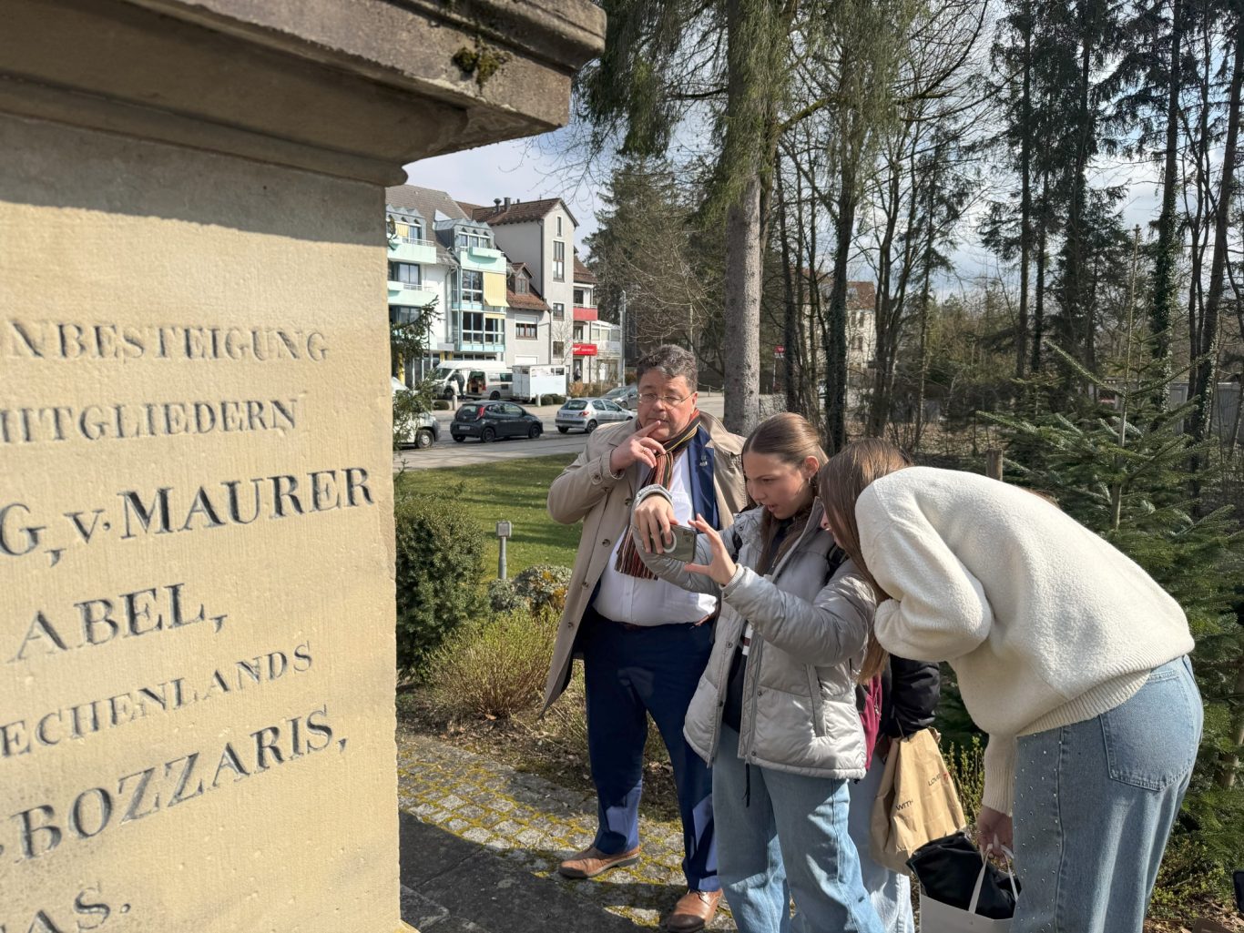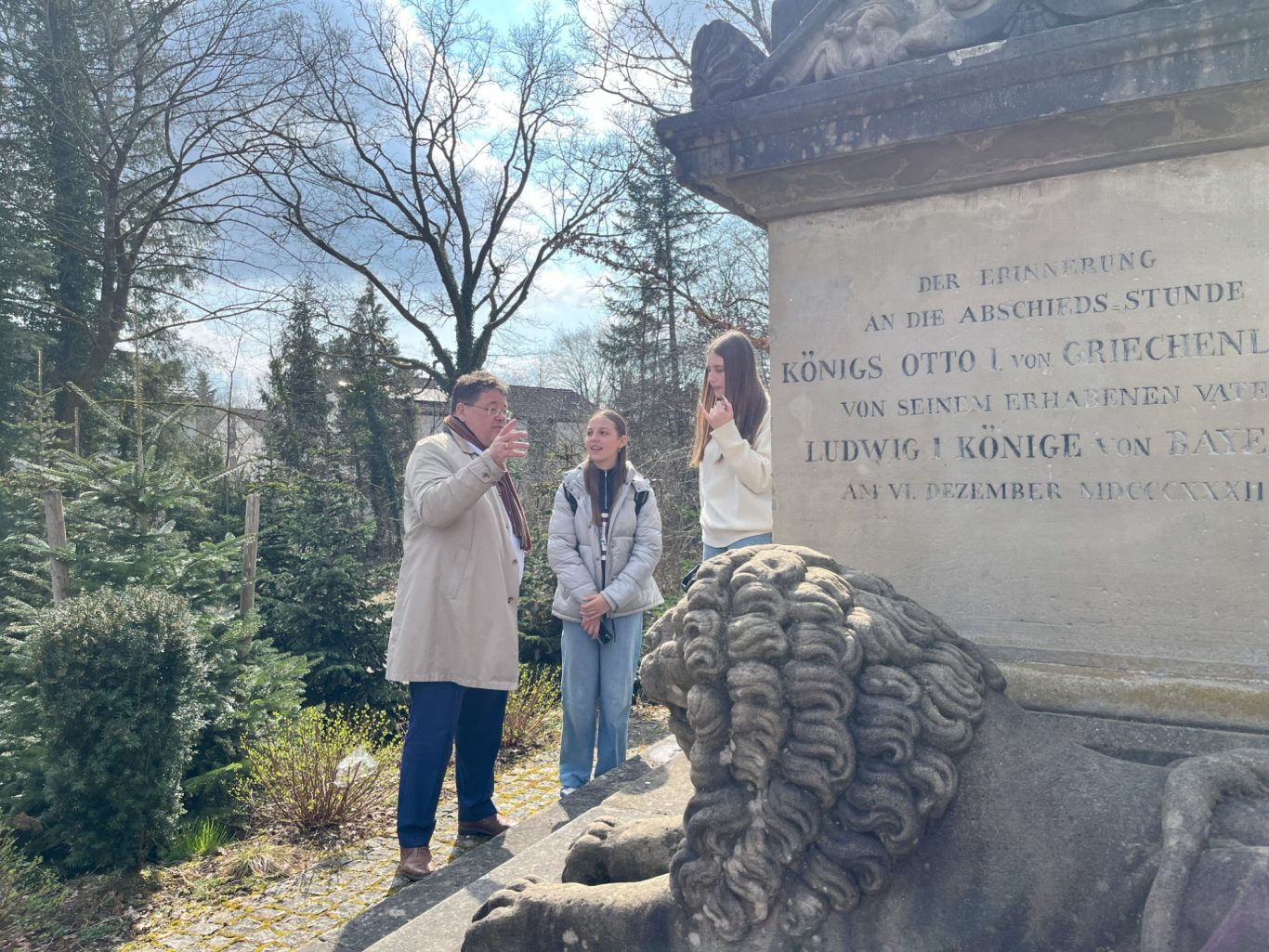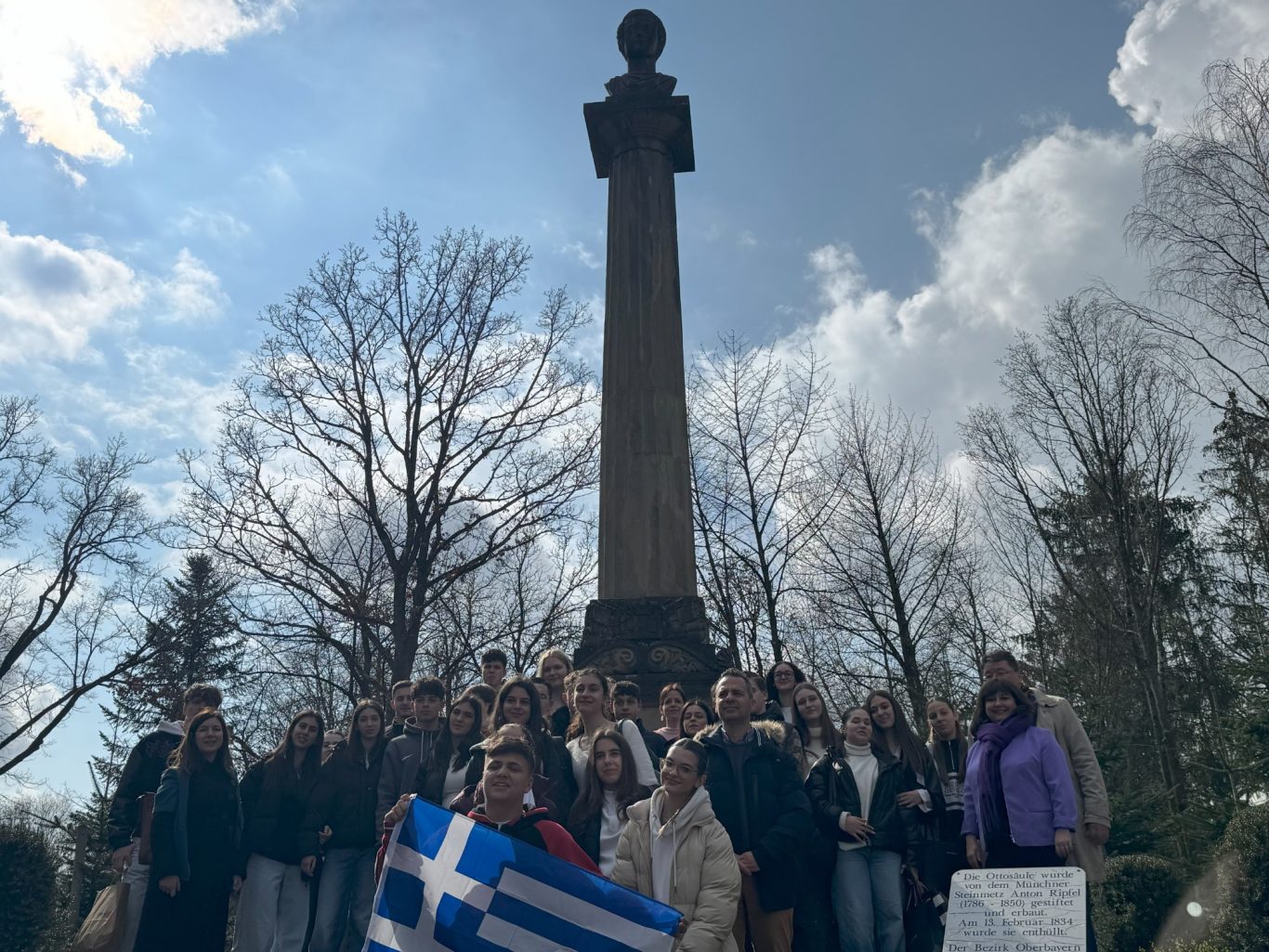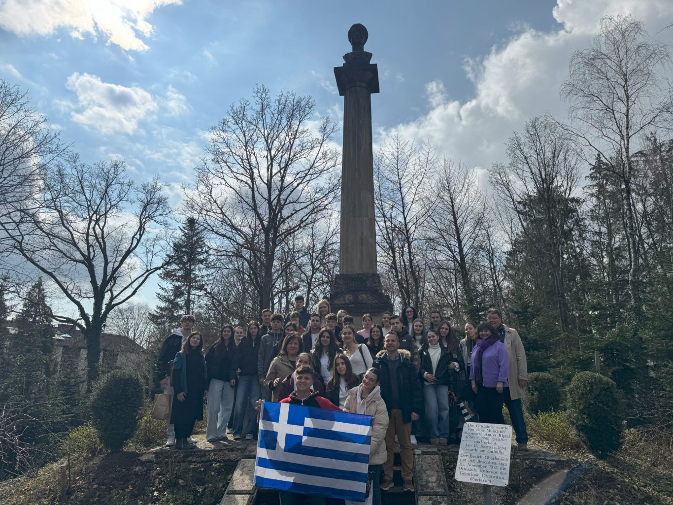 Und genau an diesem geschichtsträchtigen Ort trafen sich am Dienstag Schülerinnen und Schüler der beiden Partnerschulen, um gemeinsam mehr über die Ottosäule zu erfahren. Hr. Loderer, der erste Bürgermeister der Gemeinde Ottobrunn, selbst erzählte den wissbegierigen Schülerinnen und Schüler Interessantes über die Ottosäule und deren Inschriften.