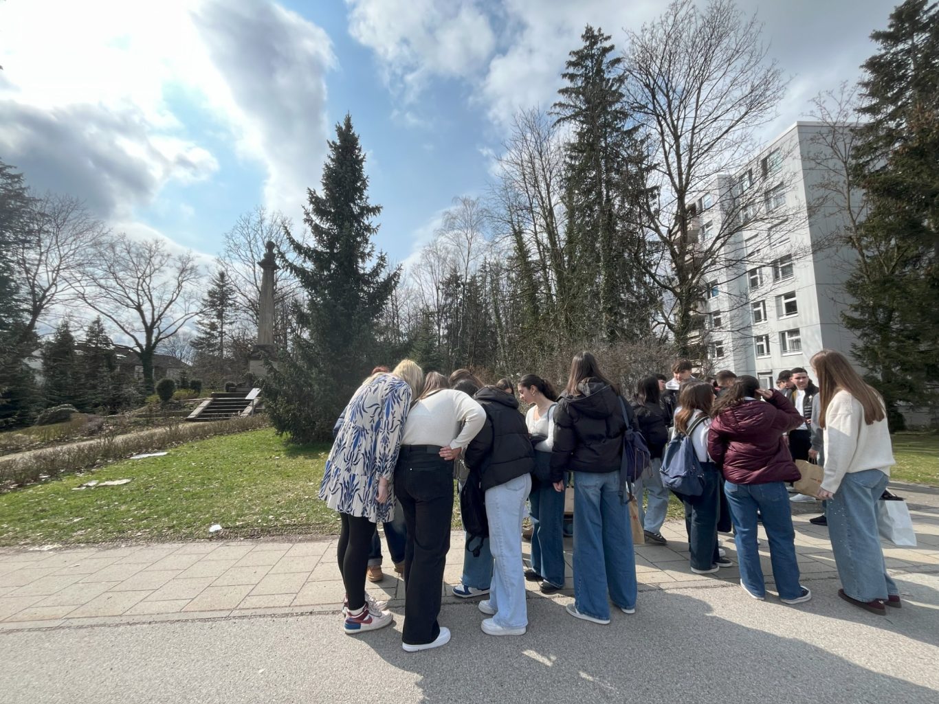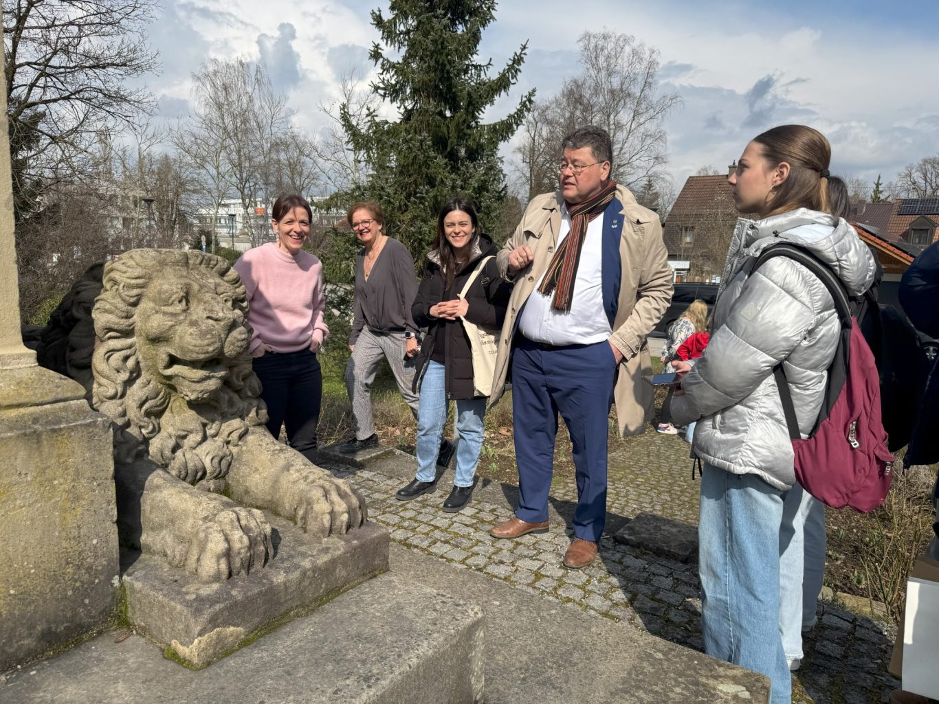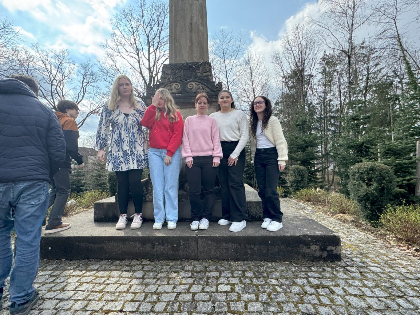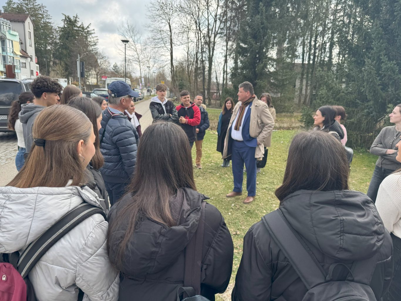 Und genau an diesem geschichtsträchtigen Ort trafen sich am Dienstag Schülerinnen und Schüler der beiden Partnerschulen, um gemeinsam mehr über die Ottosäule zu erfahren. Hr. Loderer, der erste Bürgermeister der Gemeinde Ottobrunn, selbst erzählte den wissbegierigen Schülerinnen und Schüler Interessantes über die Ottosäule und deren Inschriften.